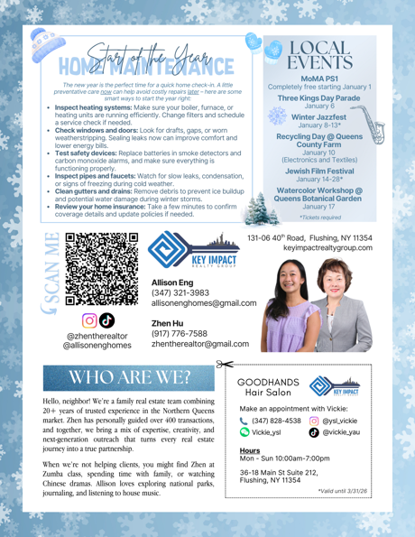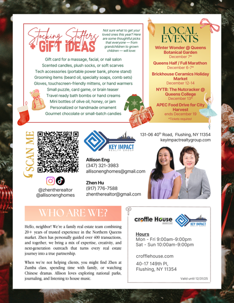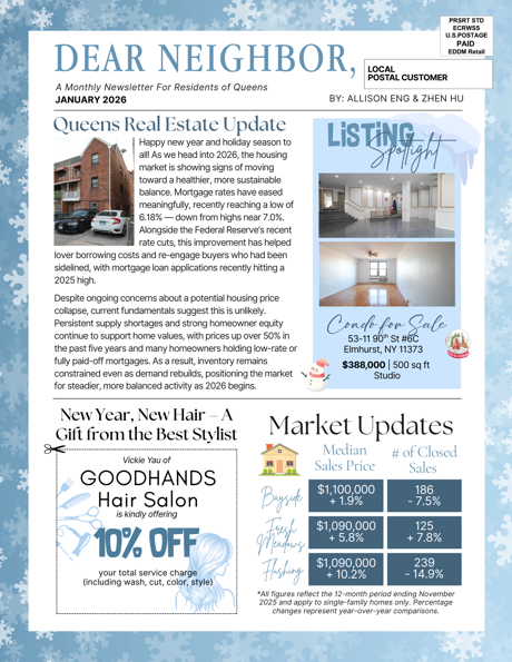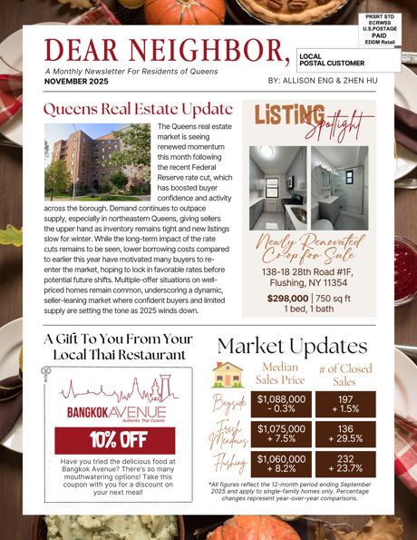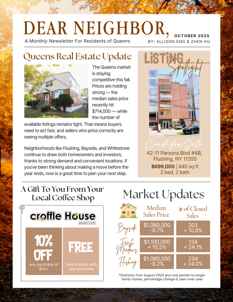 A monthly digest for Queens homeowners featuring market updates, local events, featured listings, seasonal tips, and small-business spotlights. Designed to keep our community informed and connected.